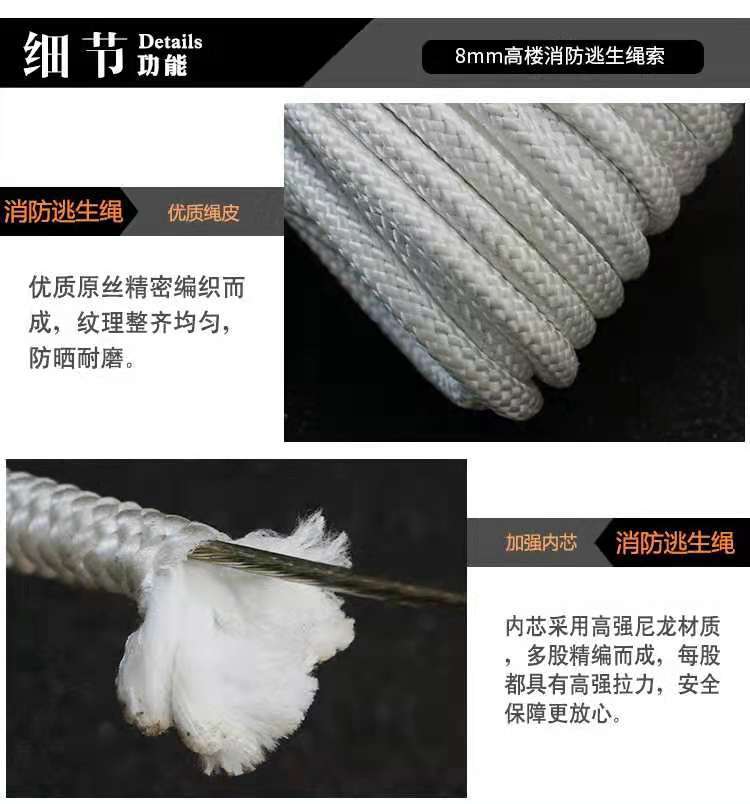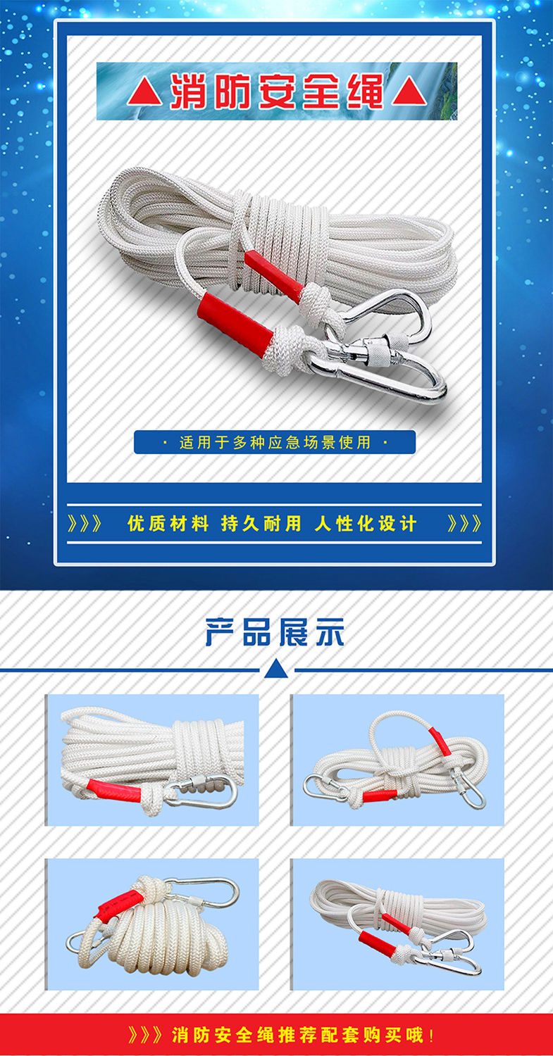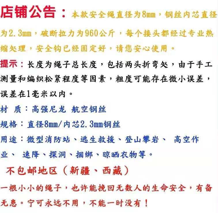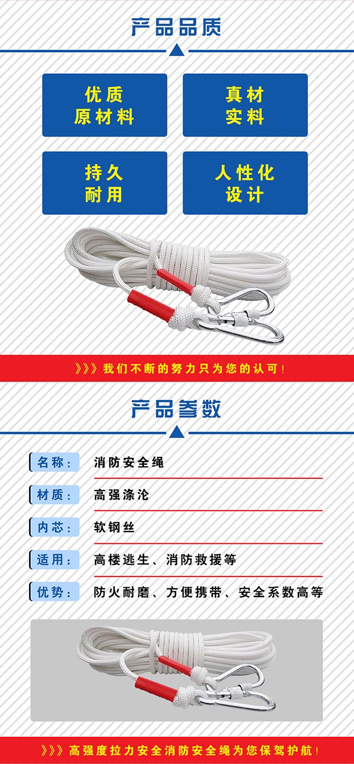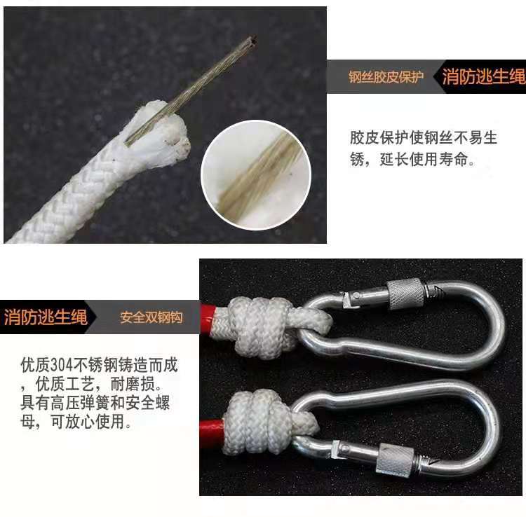 钢丝心消防安全绳收到了,质量很好,物美价廉,结实耐用,两头带保险钩,和展示的一样,诚信商家,推荐购买,物流快,服务好,五星好评。