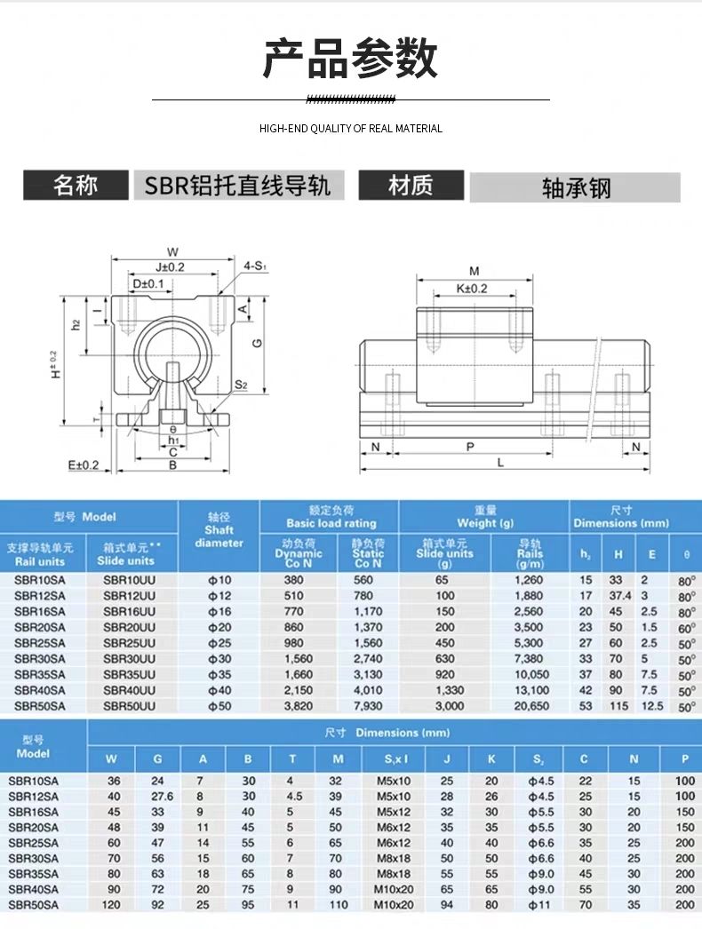 SBR guide rail slider solid linear optical axis cylindrical slide aluminum support woodworking slide push table saw track 20 full set SBR12×1rice