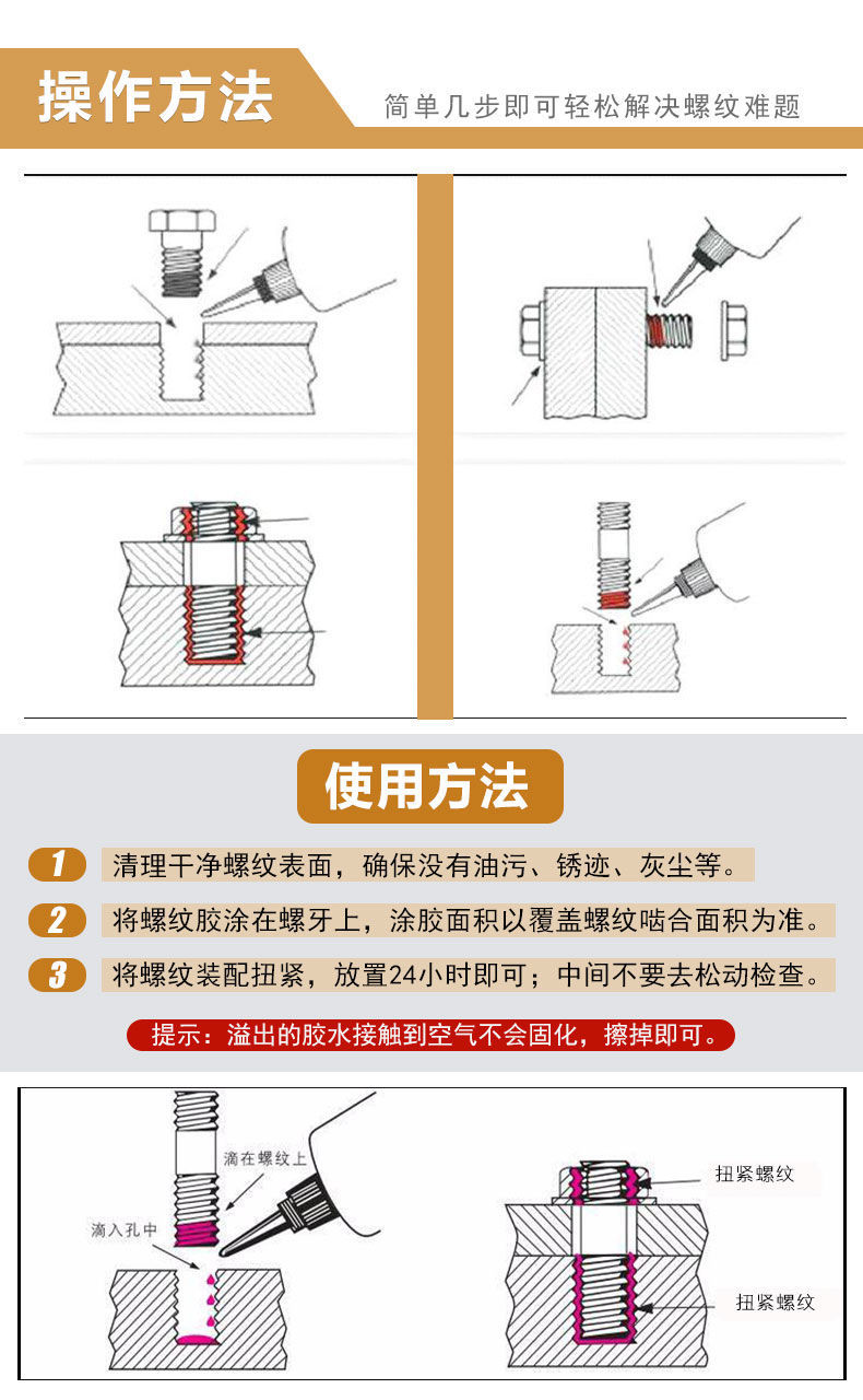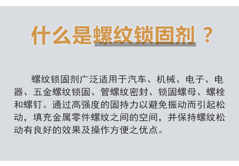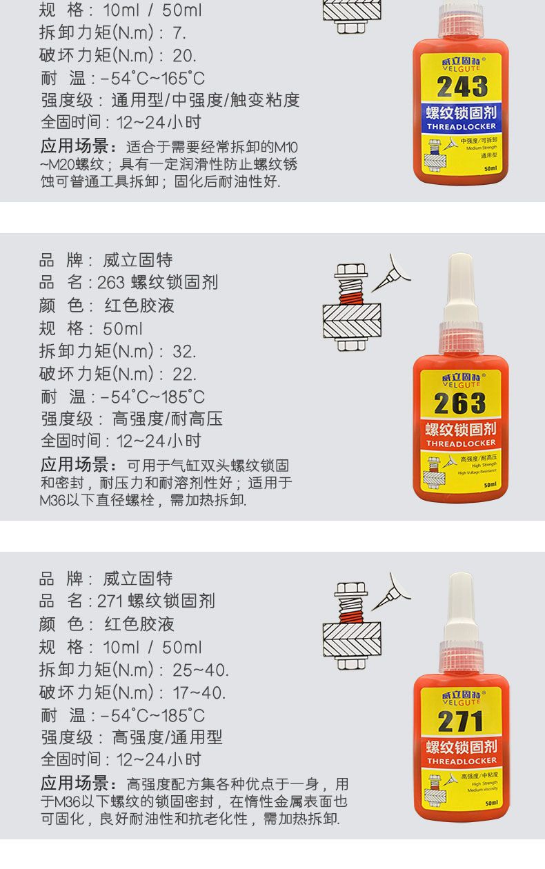 螺纹密封固定胶,包装规范,使用说明具体详细可操作性强,价格亲民,2元多钱一瓶,很适合家用。客服专业性很强,有问必答,服务态度无可挑剔,物流按时送达。
