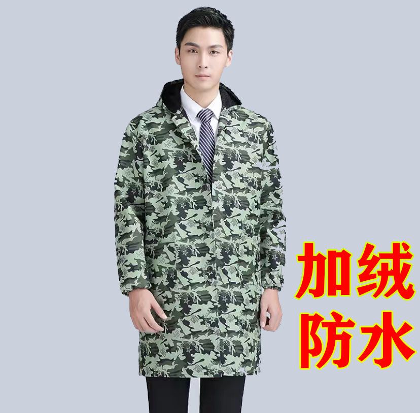 plush and thickened overalls, waterproof and oil-proof, men's apron work clothes, women's work clothes with hood, winter outerwear, women's medium and long yellow floral (plus velvet with hood) +small size (90-12 recommended