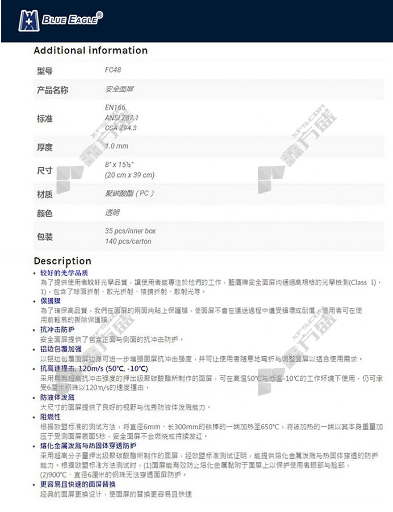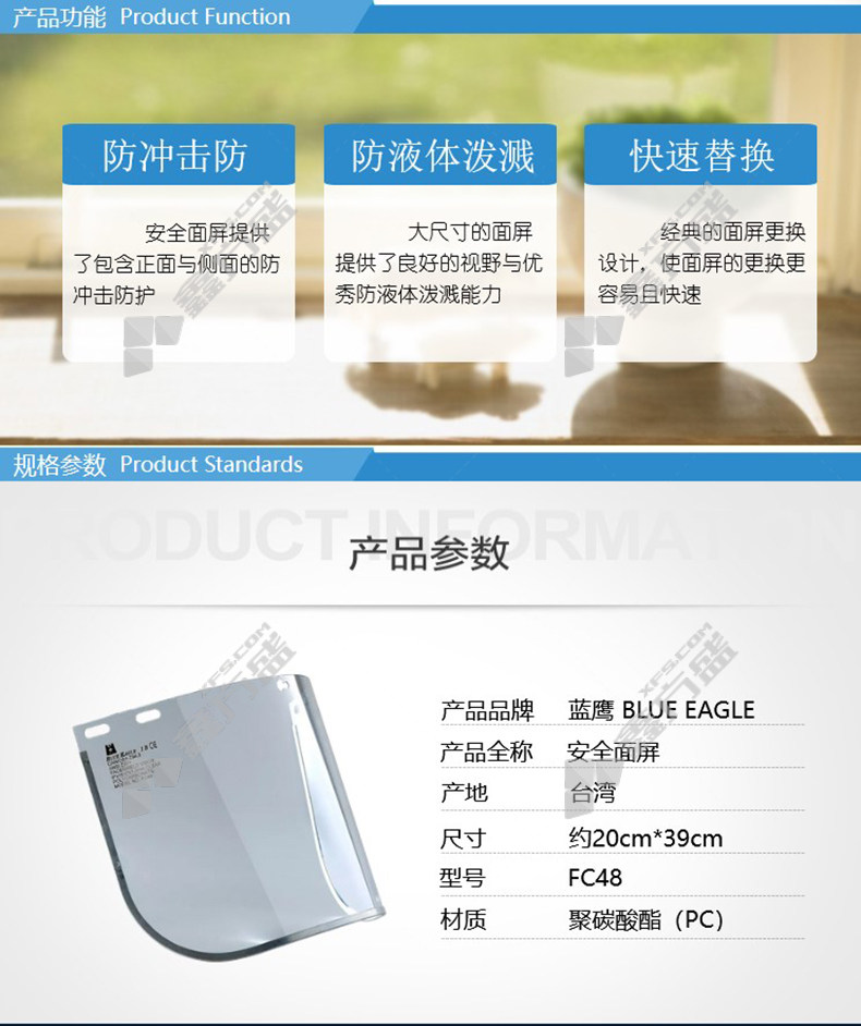 blue eagle high speed impact protection PC protective visor FC48N FC48N 20cm*39cm*1.0mm transparent without specifications