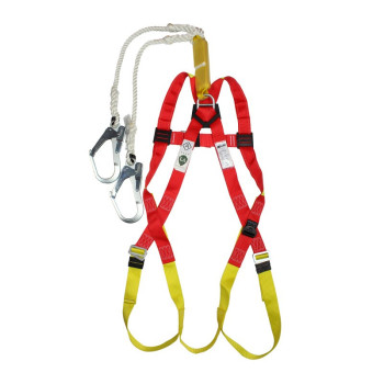 Full-body double-lanyard safety harness with two large hooks, red and blue, unspecified size. Full-body double lanyard safety harness with two-meter rope, red and blue, unspecified size.