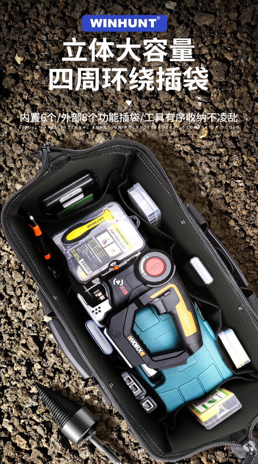 这个包的容量很大,跟这个板凳相比,放下一个锂电锤和角磨机电钻都可以放进去。